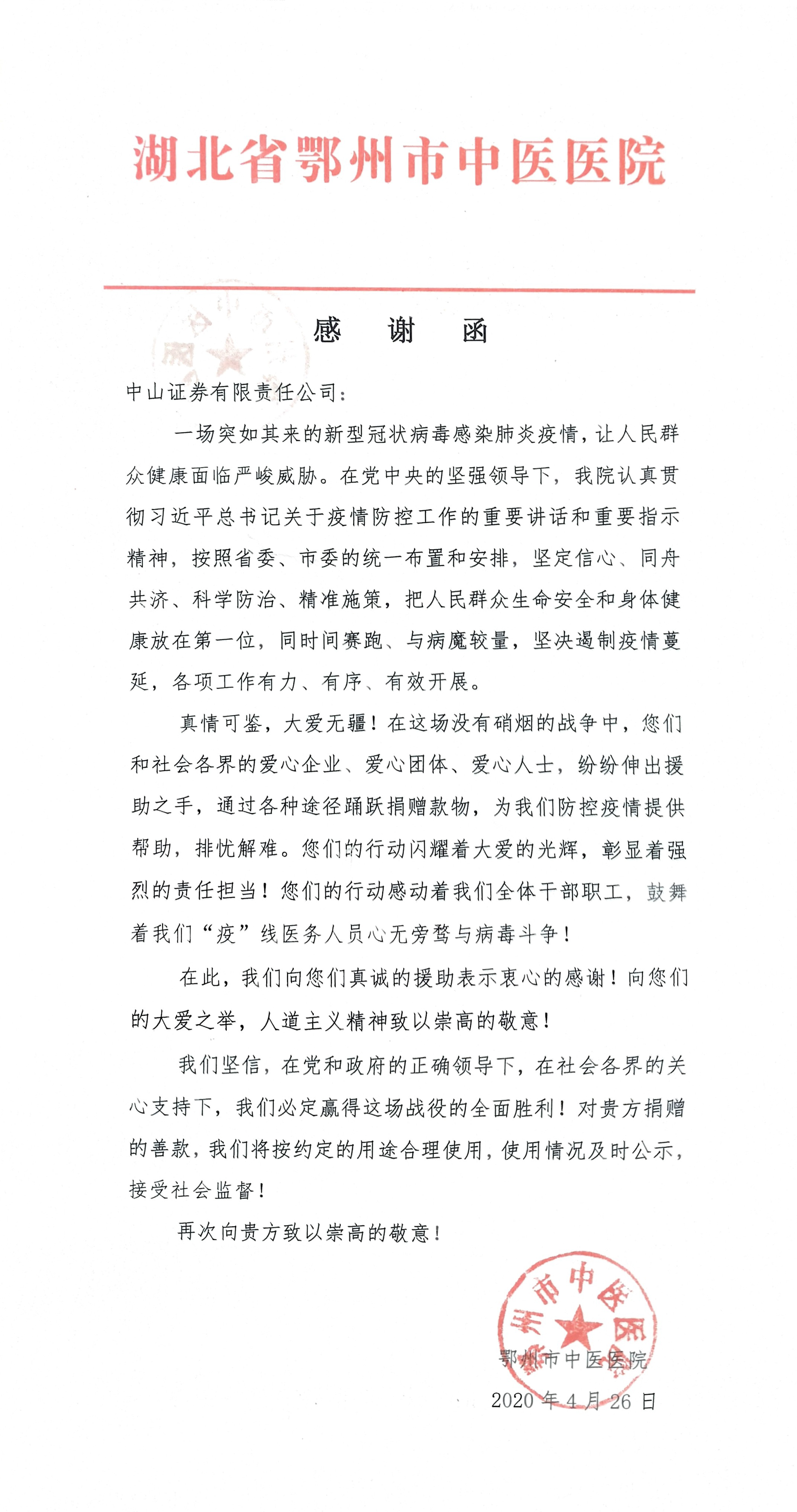 在收到善款后,鄂州市中心医院、鄂州市第三医院和鄂州市中医医院第一时间向中山证券发来了感谢信。信中他们表示中山证券的行动,闪耀着大爱的光辉,彰显了强烈的责任担当,更鼓舞着“疫”线医务人员心无旁骛与病毒斗争。