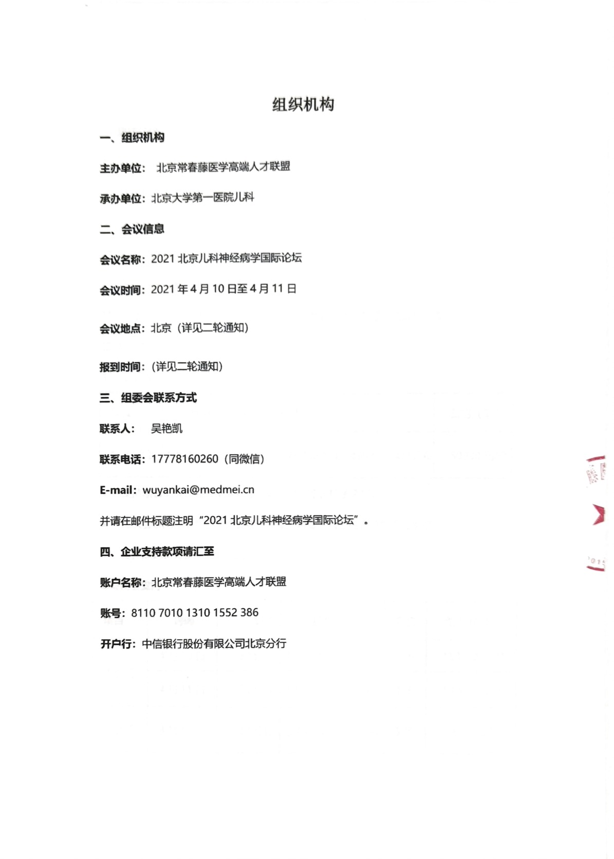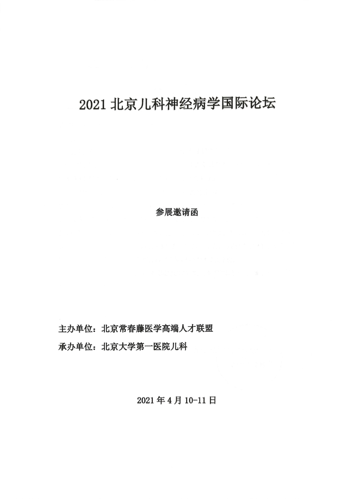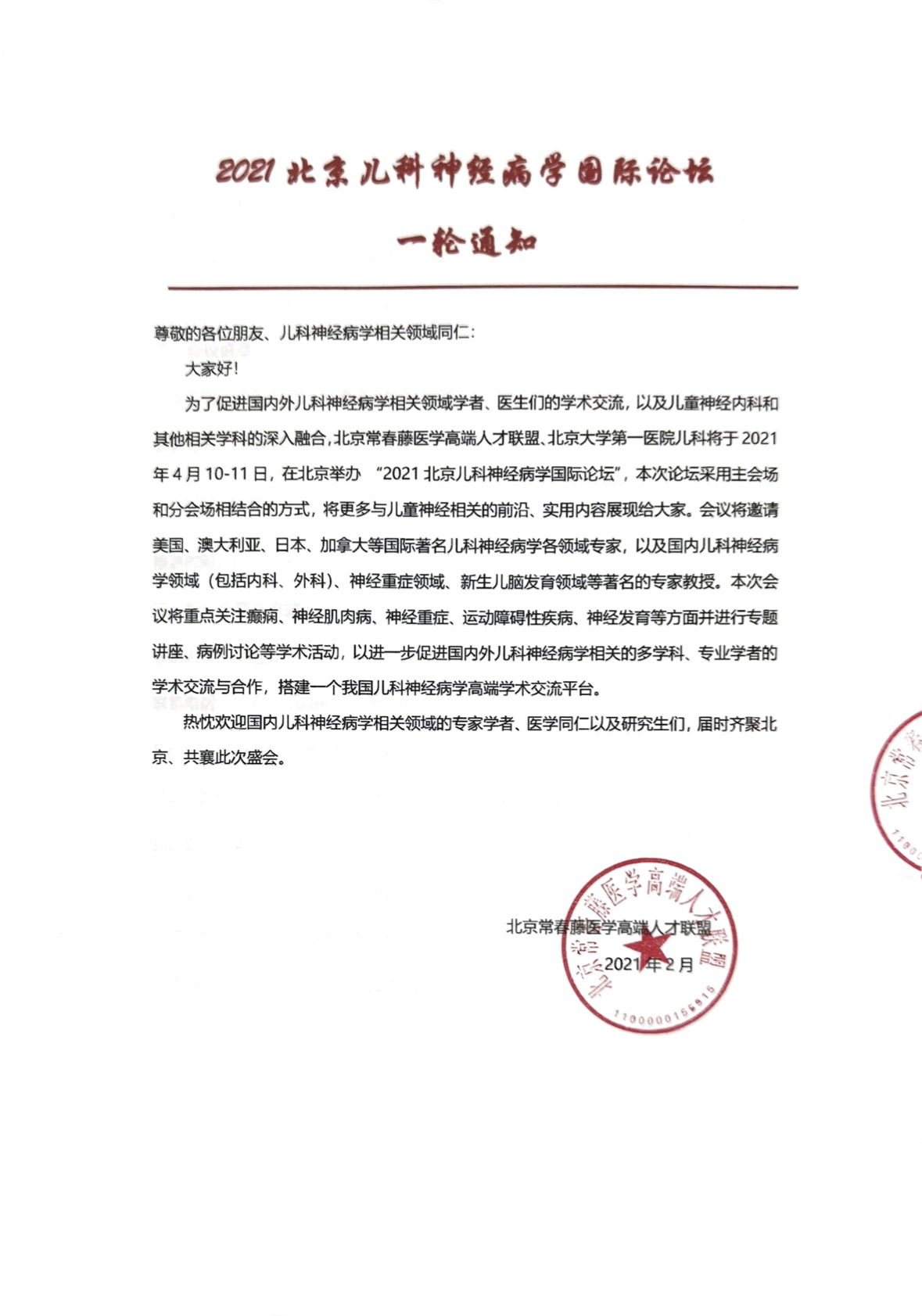北京常春藤医学高端人才联盟、北京大学第一医院儿科将于2021年4月10-11日,在北京举办 “2021北京儿科神经病学国际论坛”,现就详细事宜公示如下: